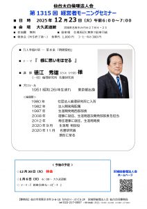 2025年12月21日 / 最終更新日時 : 2025年12月21日 taihaku 重要なお知らせ 2025年12月30日(火) 経営者モーニングセミナーは休会となります。 FacebooktwitterHatenaPocket コメントを残す コメントをキャンセルメールアドレスが公開されることはありません。 * が付いている欄は必須項目ですコメント 名前 * メール * サイト 次回のコメントで使用するためブラウザーに自分の名前、メールアドレス、サイトを保存する。 上に表示された文字を入力してください。